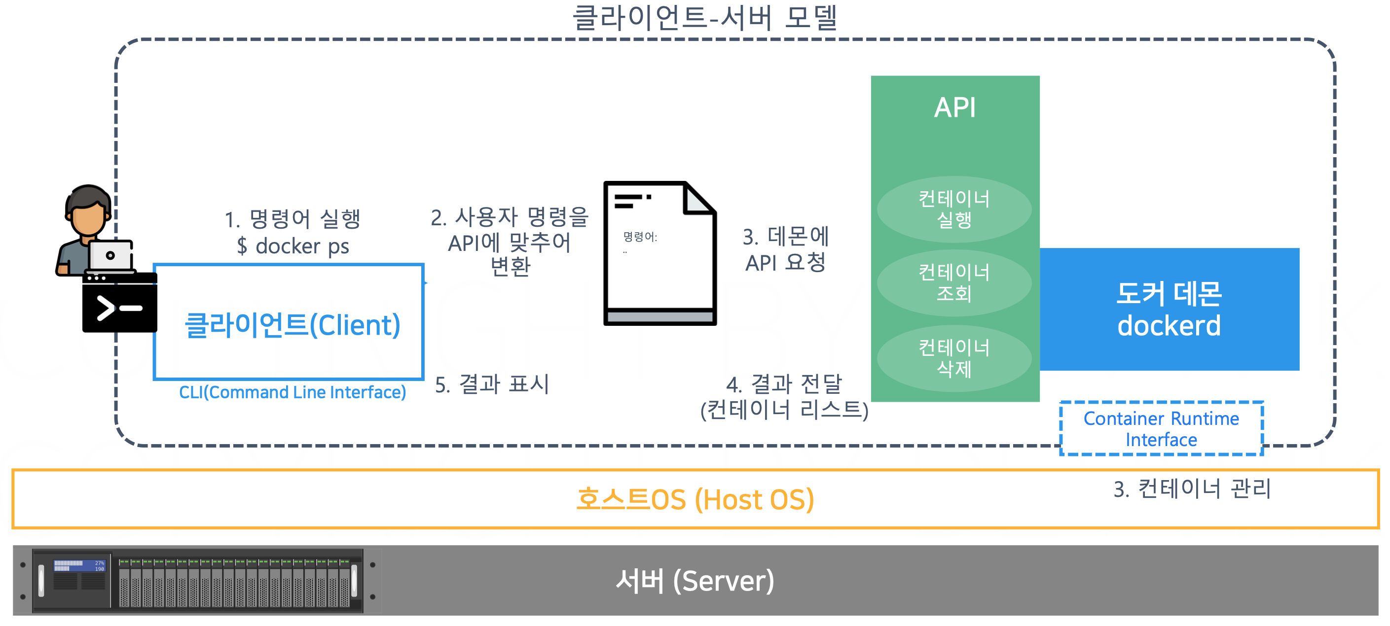 - 사용자는 클라이언트에서 명령어를 실행하면, 해당 명령은 API를 통해 도커 데몬으로 전달된다.