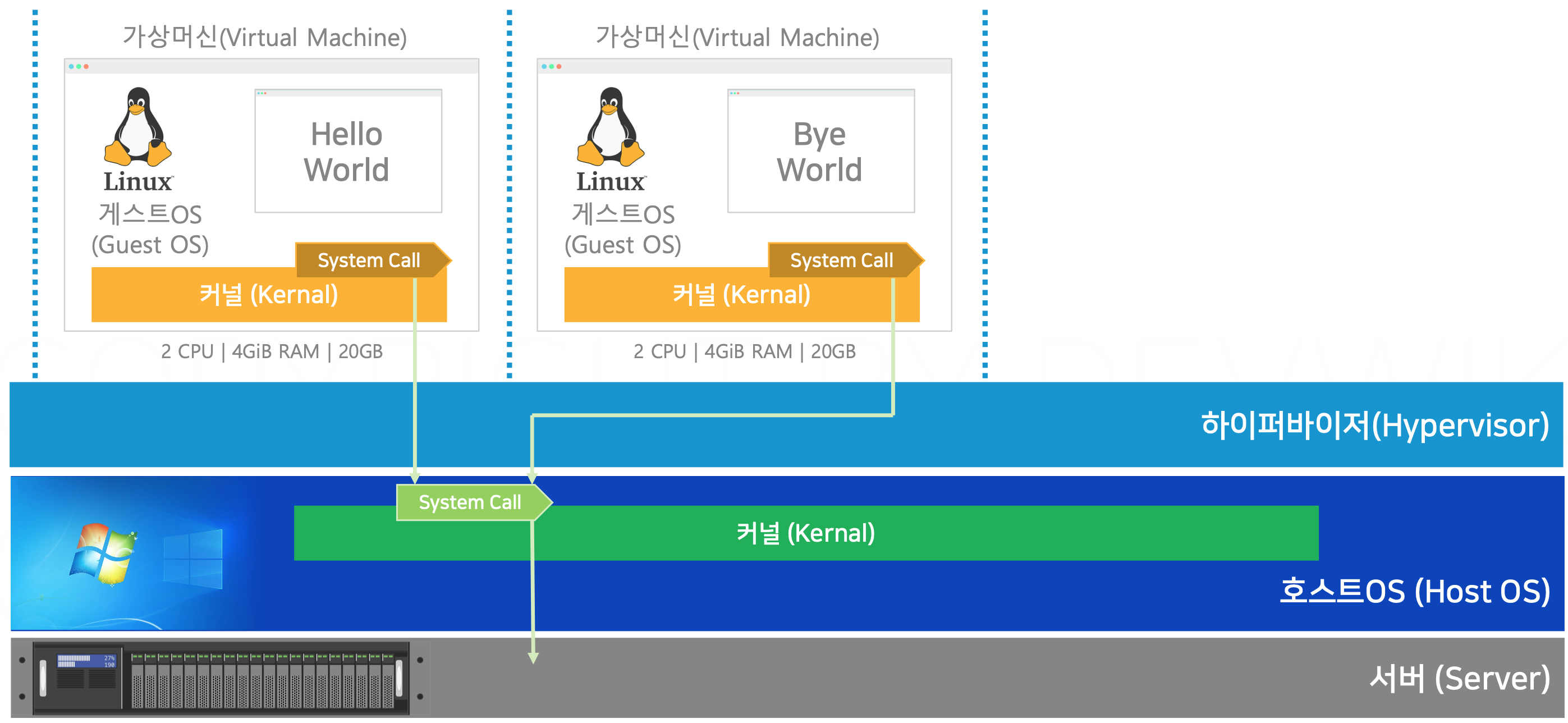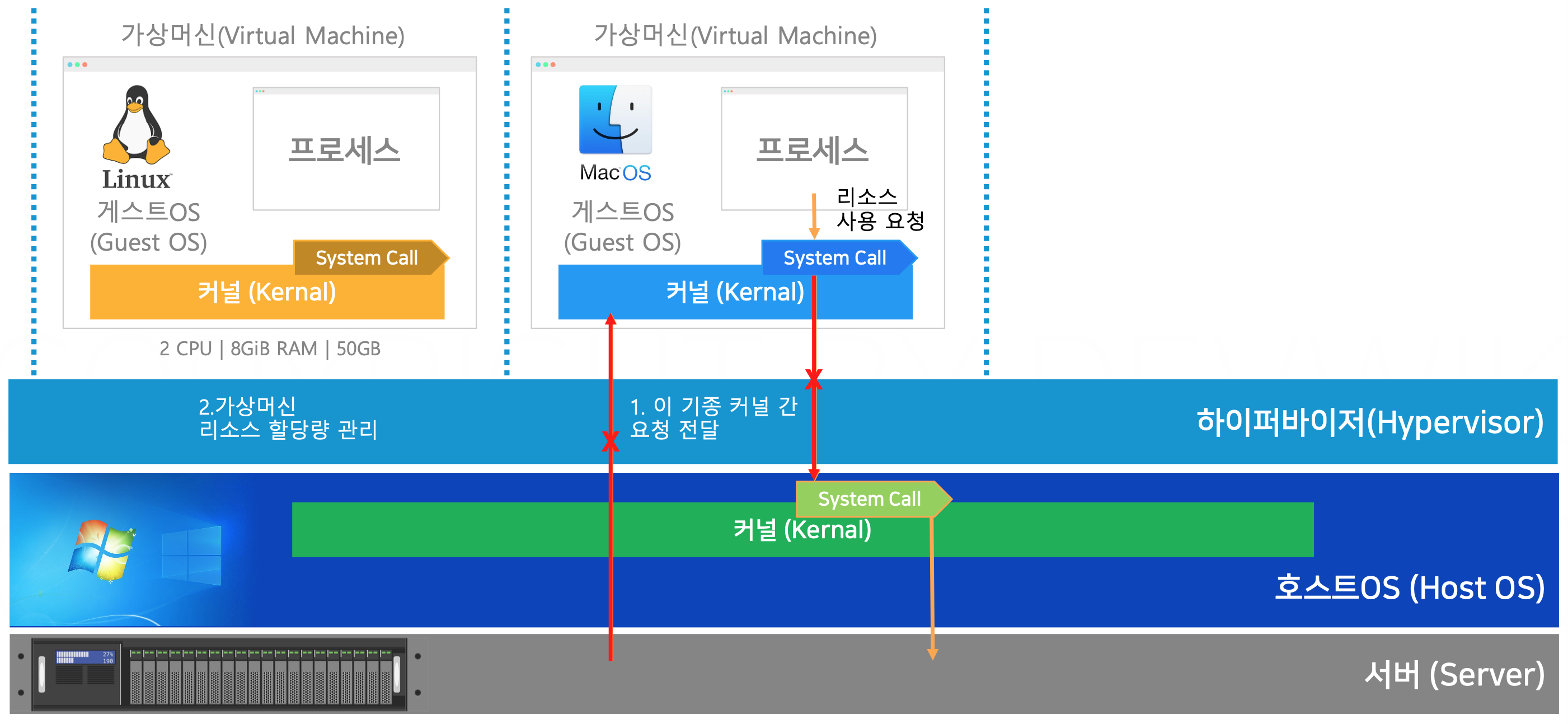- 각 가상 머신의 프로세스는 시스템 호출(System Call)을 통해 자신의 커널을 거쳐 자원을 요청한다.