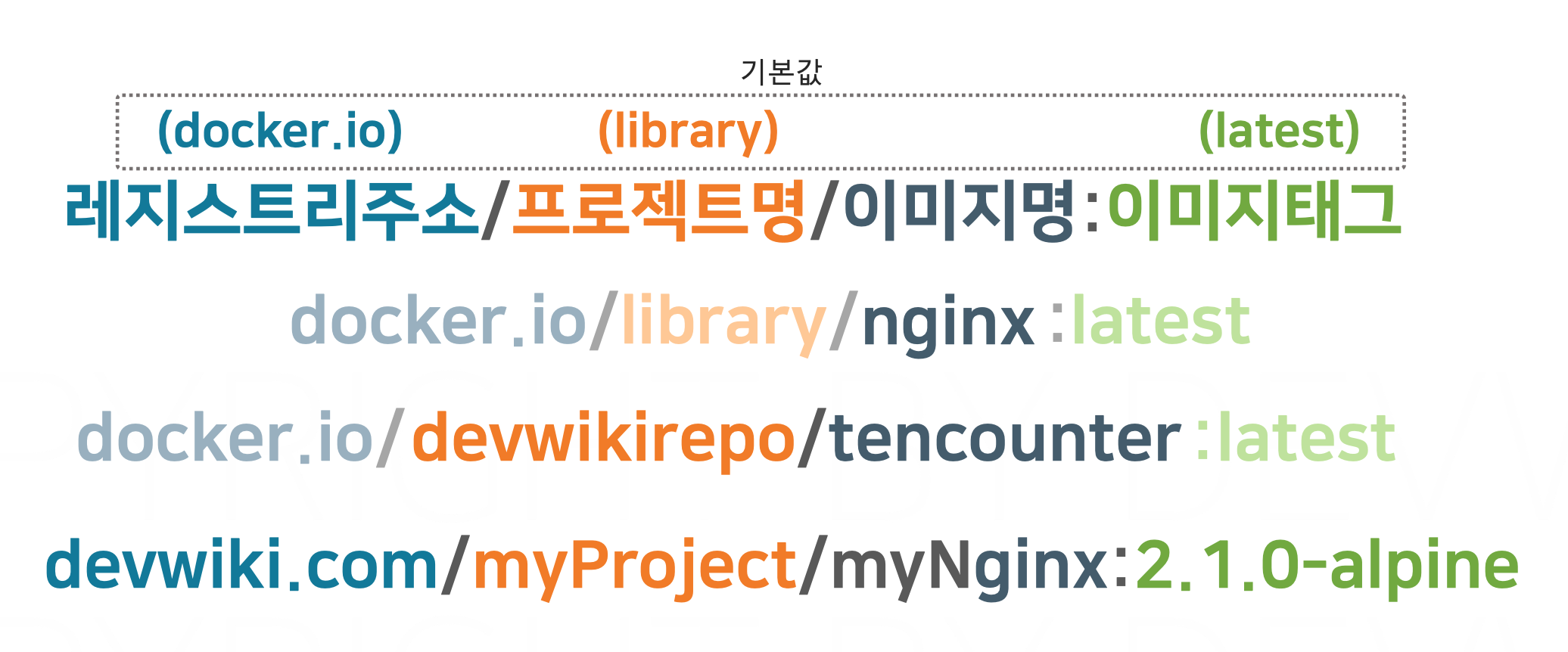 - 레지스트리 주소는 도커 허브를 사용할 때는 생략 가능하다.(이 경우 기본값 : docker.io)