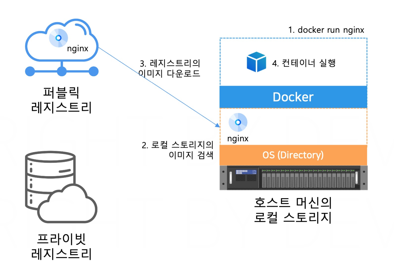 - 사용자가 docker run nginx 명령을 실행하면 도커는 Nginx 이미지를 기반으로 컨테이너를 생성하고 실행하려고 한다.