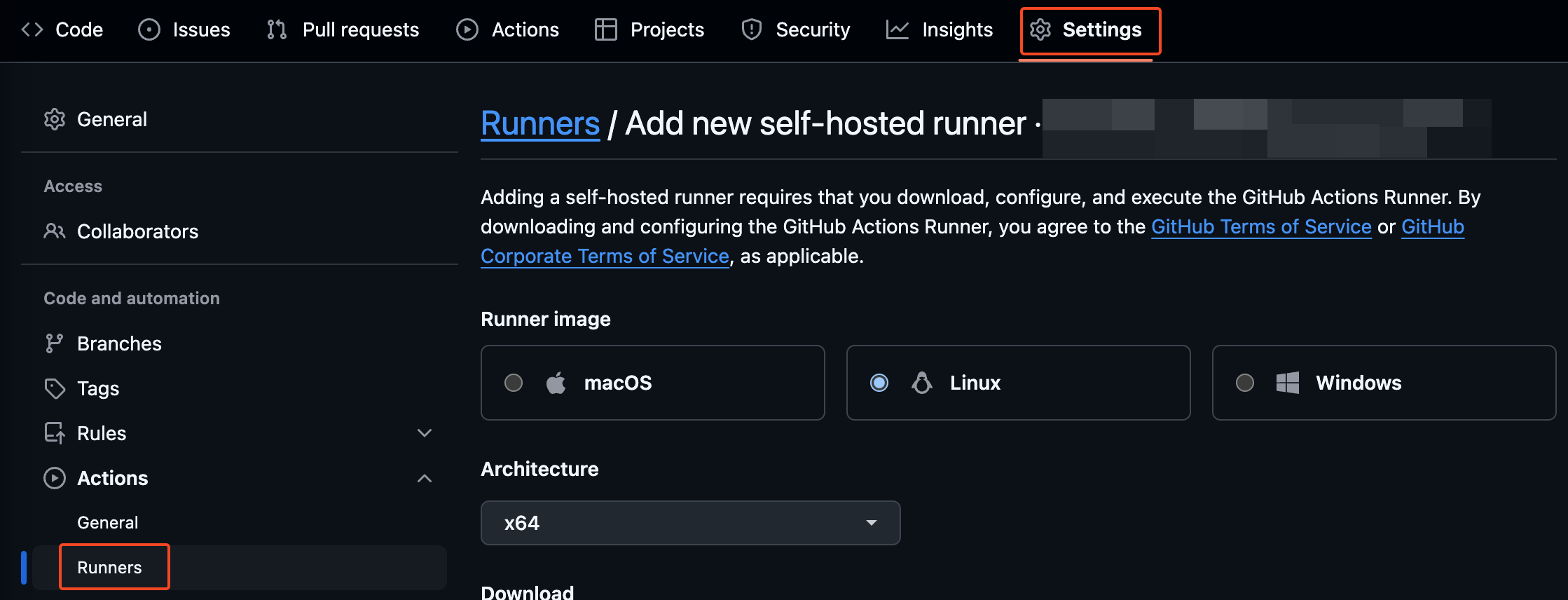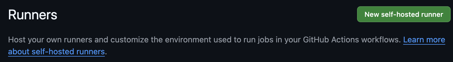 자신의 깃허브 계정에서 원하는 레포지토리의 setting 탭의 Actions -> Runners에 들어간다.