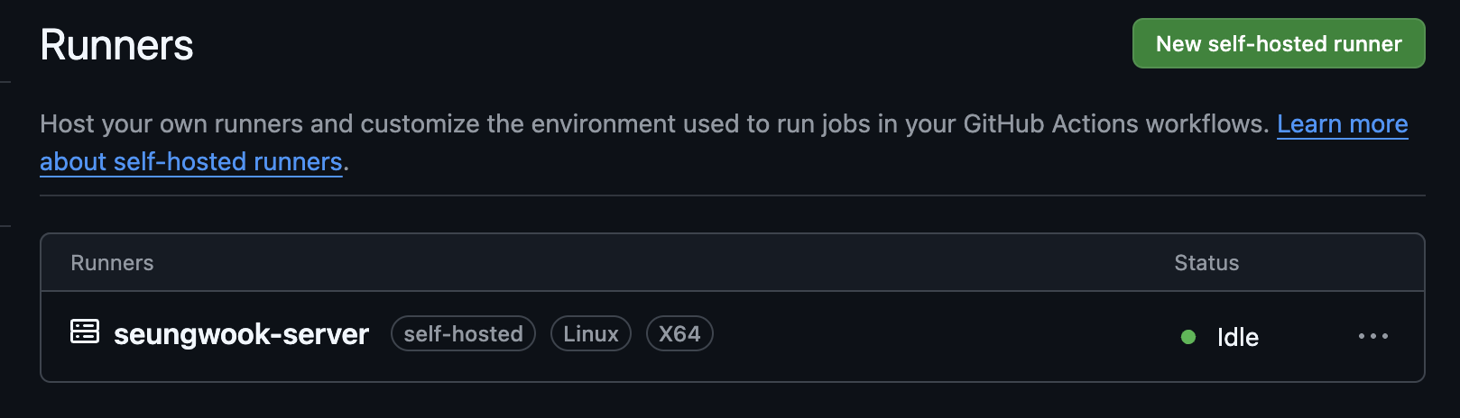 self-hosted runner를 사용한 이유는 깃허브에서 제공하는 러너를 사용하면 ssh키를 입력하여 기본 제공 러너가 내 서버로 원격 접속해서 배포를 하게 되는데, 나는 내 서버의 ssh키를 누구에게도 알려주고 싶지 않았기 때문에 이를 사용하게 되었다.