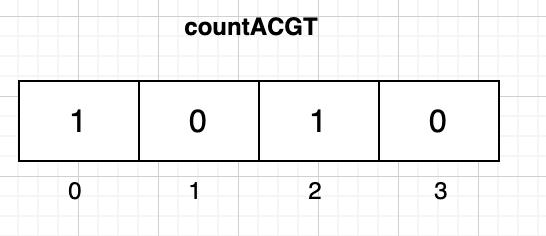 초기 윈도우 구성을 마치면 countACGT는 현재까지 윈도우에서 각 알파벳의 출현 숫자를 기록한 배열이고, 아래와 같다.