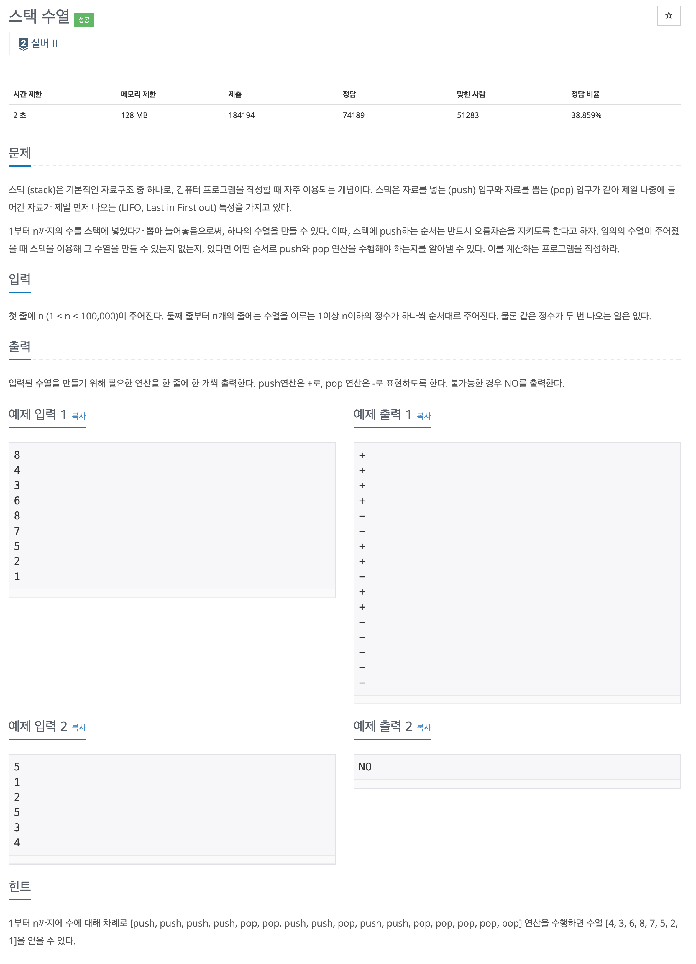 원본 링크 : https://www.acmicpc.net/problem/1874