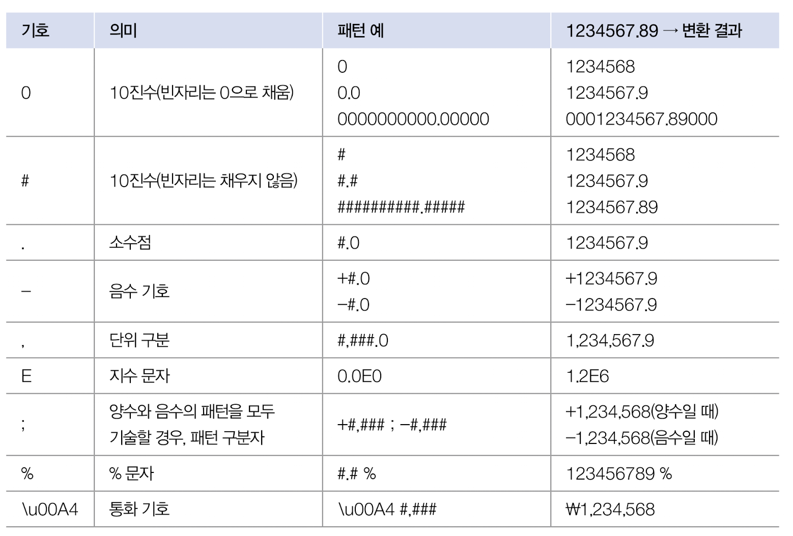 패턴 정보와 함께 DecimalFormat 객체를 생성하고 format() 메소드로 숫자를 제공하면 패턴에 따른 형식화된 문자열을 얻을 수 있다.