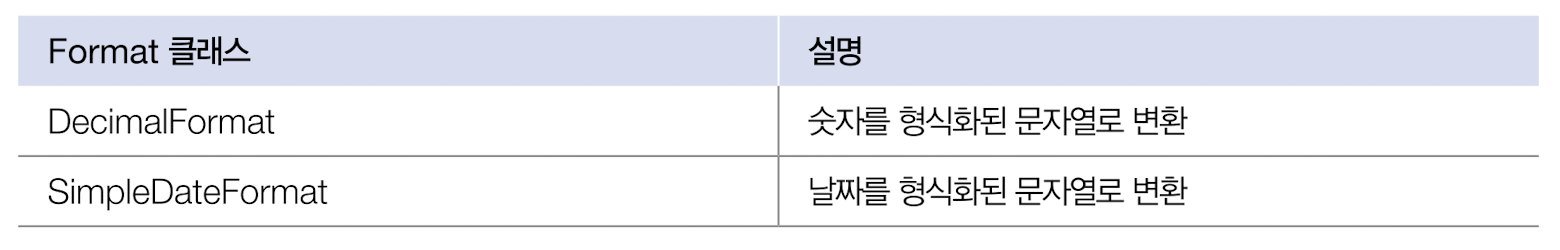 - Format 클래스는 java.text 패키지에 포함되어 있는데, 주요 Format 클래스는 다음과 같다.