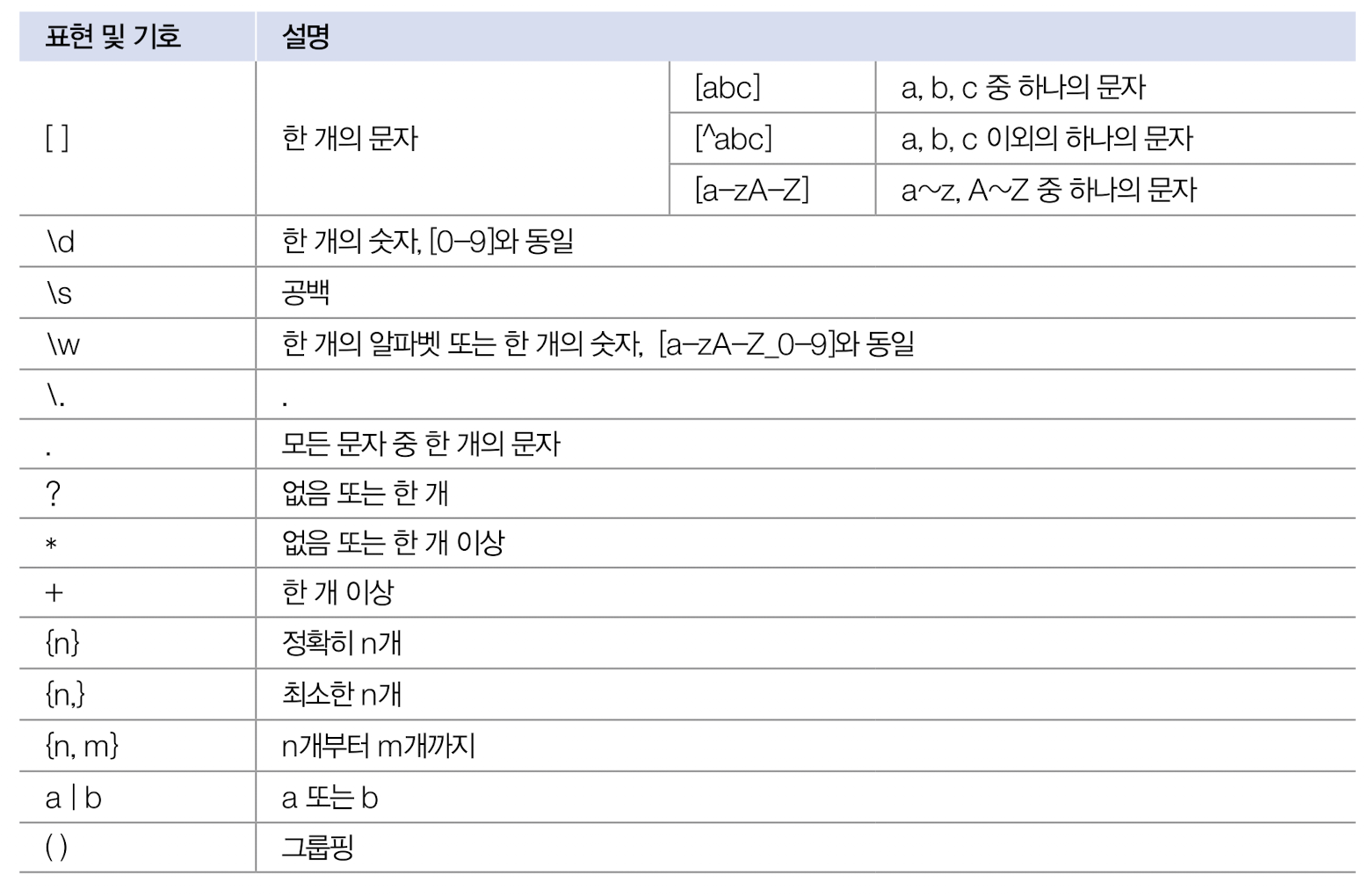 - 아래는 정규 표현식을 구성하는 표현 및 기호에 대한 설명이다.