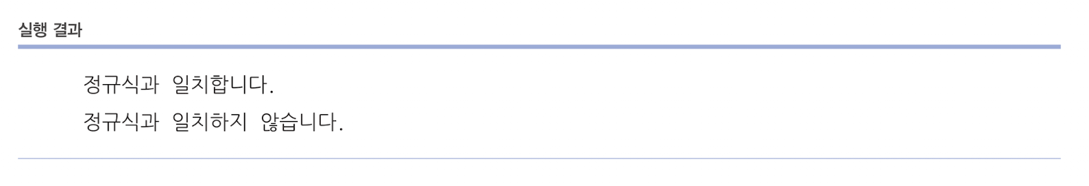 - 첫 번째 매개값은 정규 표현식이고, 두 번째 매개값은 검증할 문자열이다. 검증한 후의 결과는 boolean 타입으로 리턴된다.