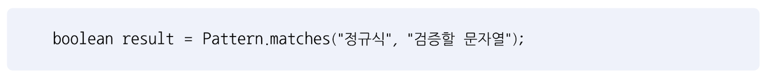 - java.util.regex 패키지의 Pattern 클래스는 정규 표현식으로 문자열을 검증하는 matches() 메소드를 제공한다.