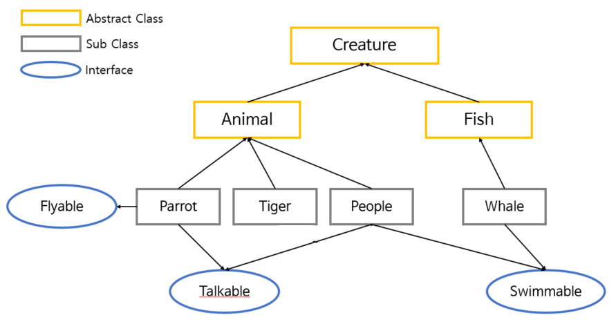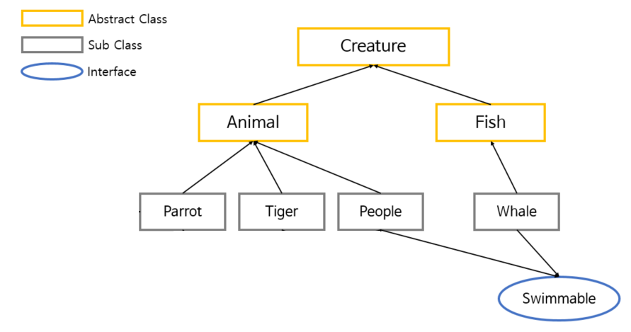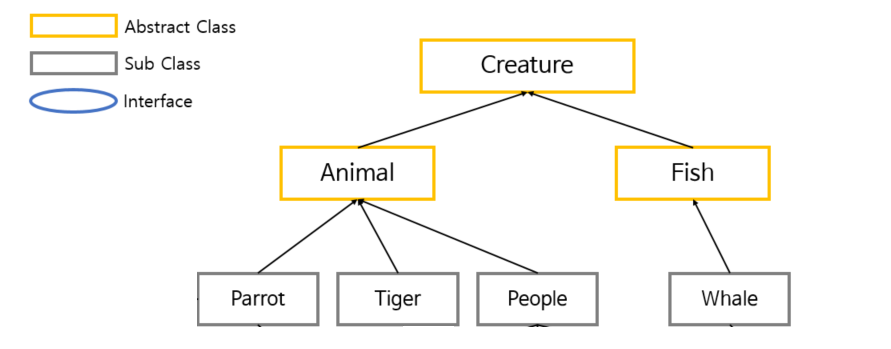 다음과 같이 Creature 라는 최상위 추상 클래스와 그 하위 추상 클래스인 Animal, Fish 가 있고, 각 추상 클래스를 구체적으로 의미 부여해 구현한 Parrot, Tiger, People 클래스와 Whale 클래스가 있다고 가정하자.