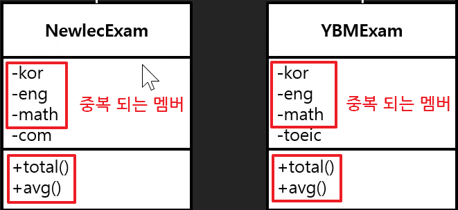위의 다양한 종류의 Exam 시험 클래스에서 공통적으로 보는 국어, 영어, 수학 멤버 필드를 상속(extends)을 통해 상위 클래스로 묶고, 메서드도 통합하며 추상화(abstract)를 해주면서 나중에 다른 종류의 Exam 클래스를 추가/확장 하는데 있어 유연한 구조적인 객체 지향 설계를 만들수 있게 된다.