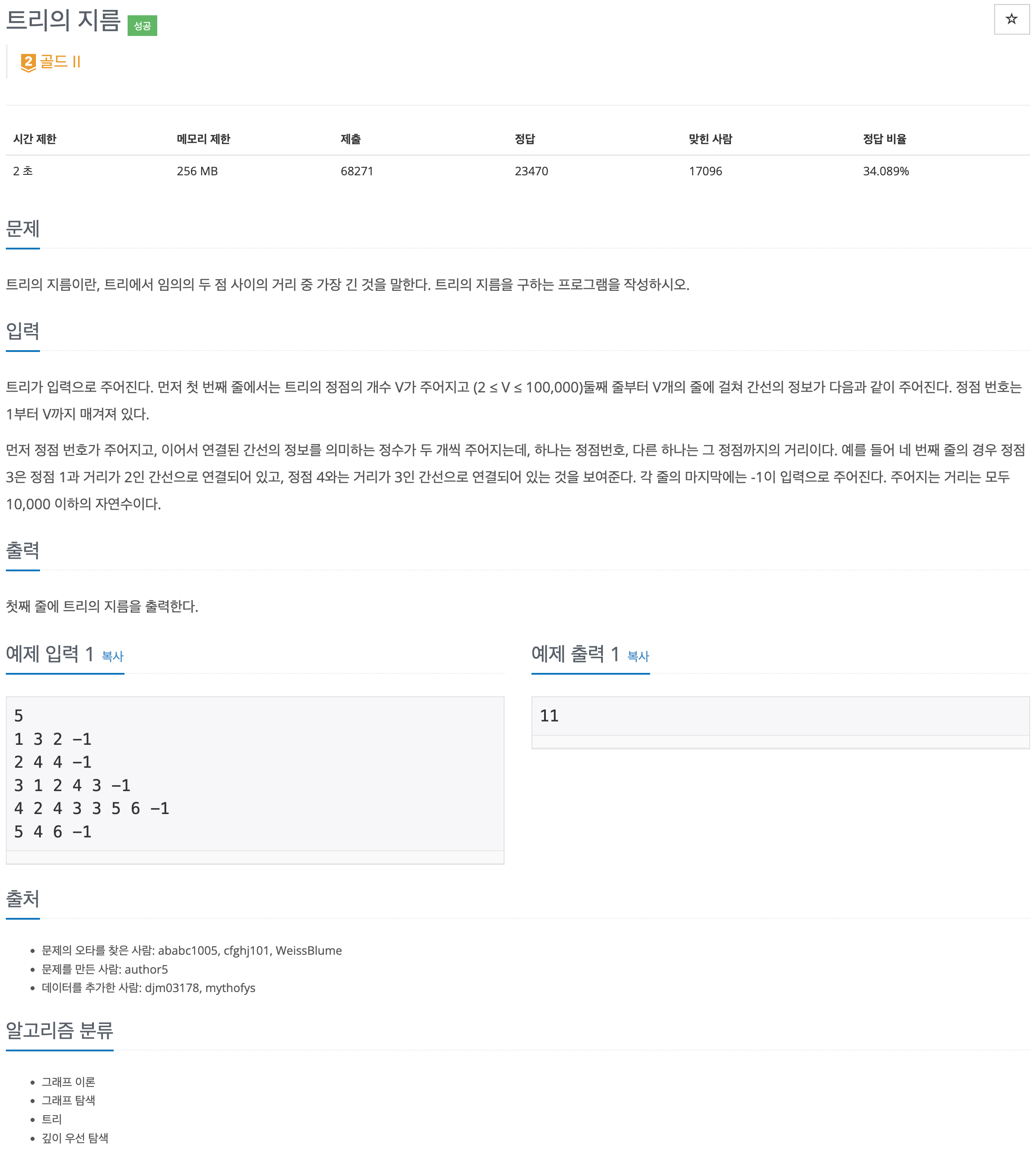 이후 같은 방법으로 노드 5에서부터 가장 먼거리를 탐색하면 노드 1이고, 노드 5와 노드 1간의 거리는 11이다.