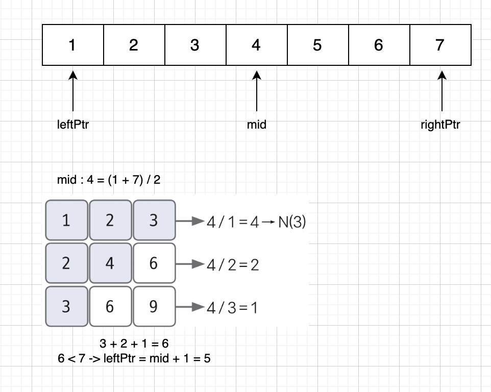 - 이진 탐색의 끝을 rightPtr이라 표현하고 7로 정한다.