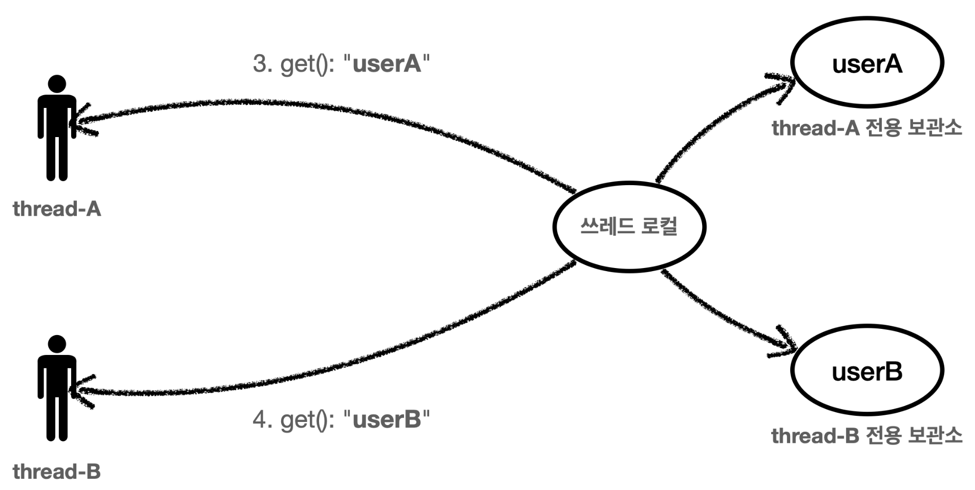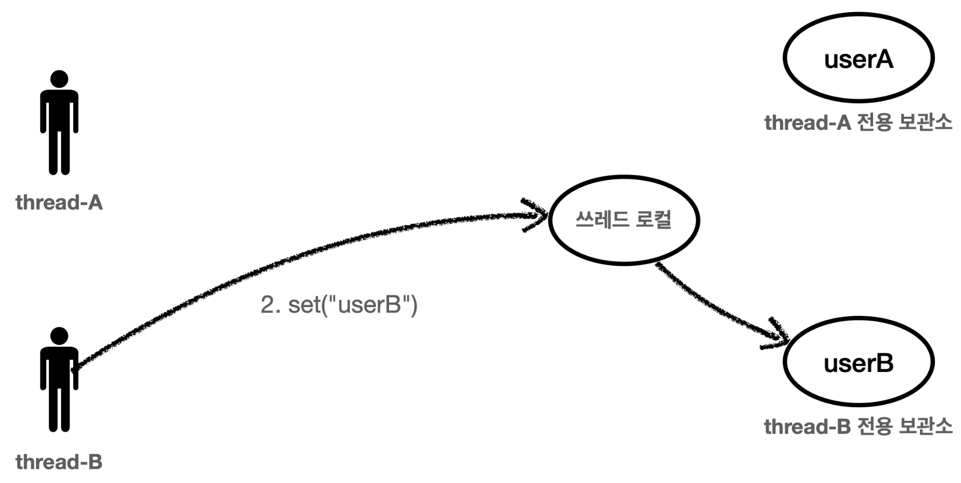- thread-B 가 userB 라는 값을 저장하면 쓰레드 로컬은 thread-B 전용 보관소에 데이터를 안전하게 보관한다.