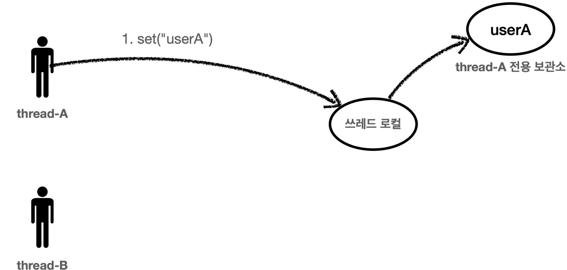- thread-A 가 userA 라는 값을 저장하면 쓰레드 로컬은 thread-A 전용 보관소에 데이터를 안전하게 보관한다.