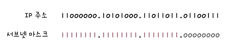 이 IP 주소와 서브넷 마스크를 2진수로 표기하면 아래와 같다.