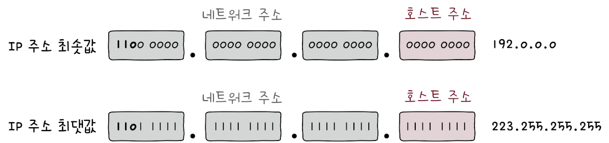 C 클래스로 나타낼 수 있는 IP 주소의 최소값을 10진수로 표현하면 192.0.0.0, 최대값을 10진수로 표현하면 223.255.255.255이다.
