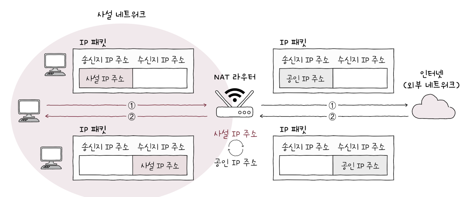 우리의 사설 네트워크상에서 만들어진 패킷 속 사설 IP 주소는 공유기를 거쳐 공인 IP로 변경되고, 외부 네트워크로 전송된다.