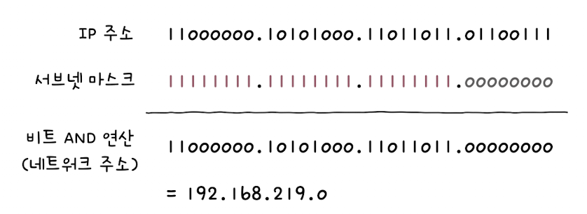 이 둘에 대해 비트 AND 연산을 수행하면 아래 결과 처럼 네트워크 주소 192.168.219.0을 구할 수 있다.