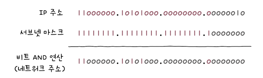 서브넷 마스크를 IP 주소 192.168.0.2와 비트 AND 연산을 하면 그 결과는 192.168.0.0이다. 즉, 네트워크 주소는 192.168.0.0이 된다.