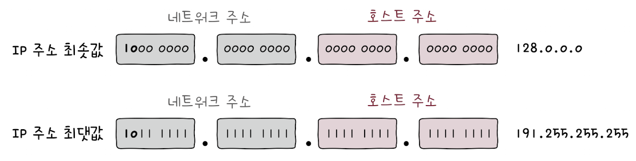 B 클래스 IP 주소의 최소값을 10진수로 표현하면 128.0.0.0, 최대값을 10진수로 표현하면 191.255.255.255이다.