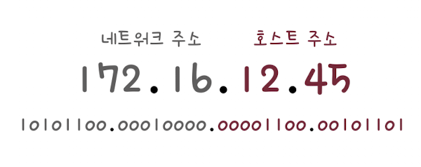 아이피는 32비트로 구성되어있고, 아래 그림은 네트워크 주소가 16비트, 호스트 주소가 16비트인 IP 주소의 예시이다.
