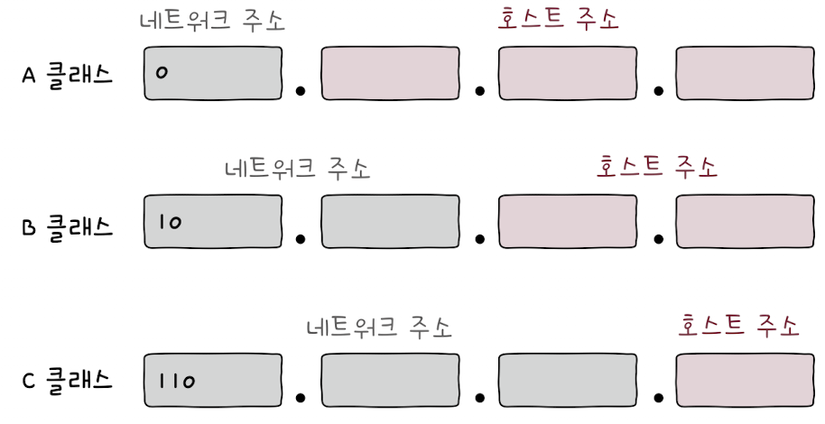 클래스풀 주소 체계에서 A 클래스의 네트워크 주소는 8비트, B 클래스의 네트워크 주소는 16비트, C 클래스의 네트워크 주소는 24비트로 이루어져 있다.