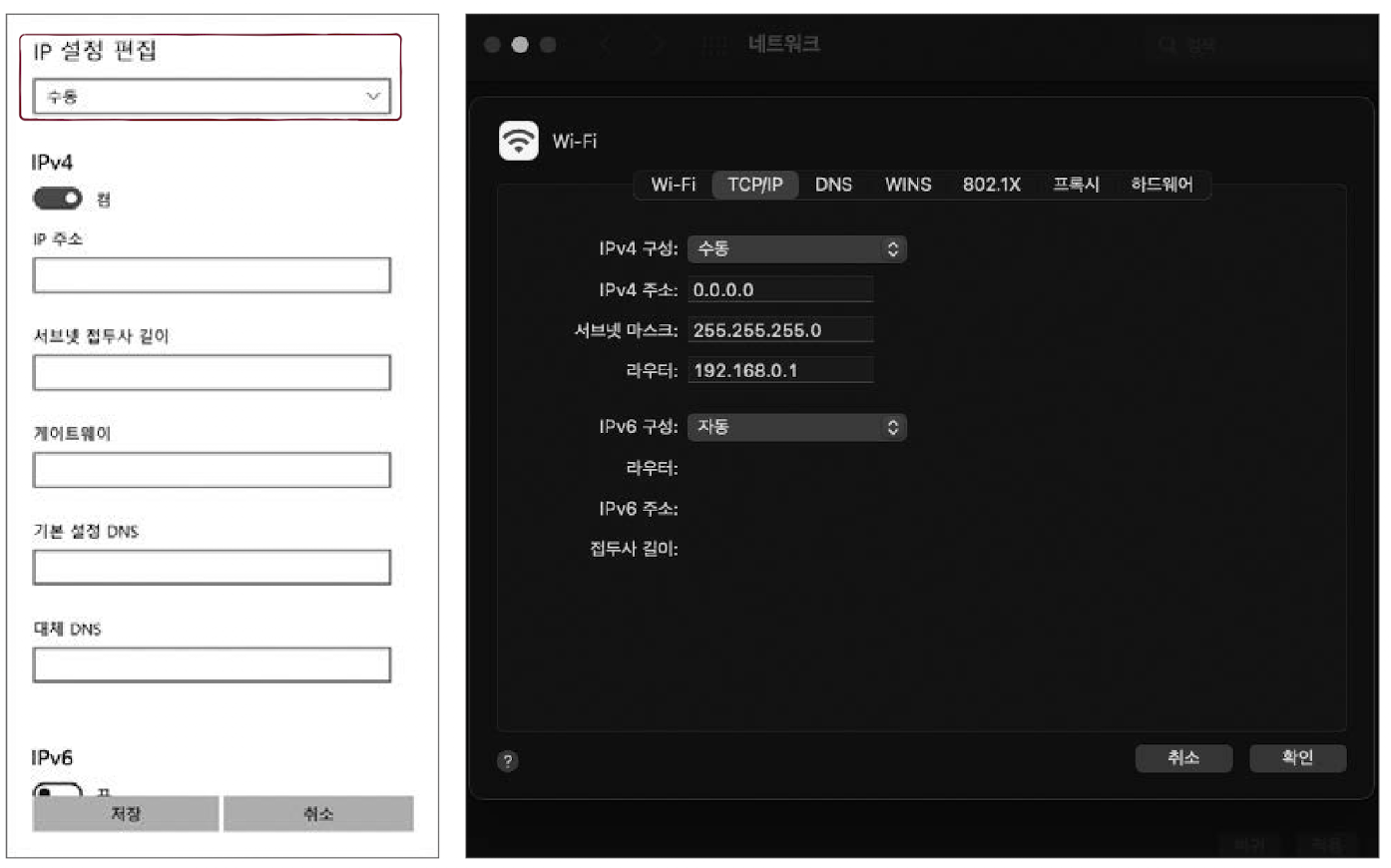 윈도우나 맥OS 등의 운영체제에서 네트워크 설정을 확인해 보면, 다음 화면처럼 IP 주소를 수동으로 설정할 수 있는 항목이 있다.