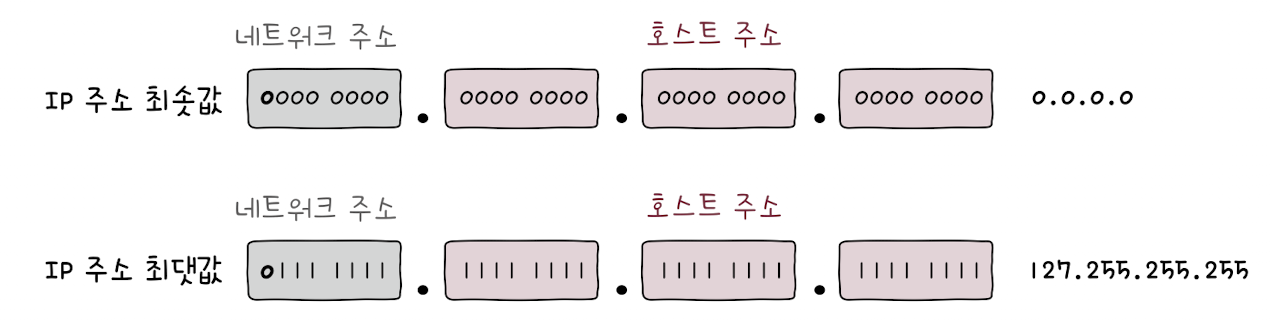 A 클래스로 나타낼 수 있는 IP 주소의 최소값을 10진수로 표현하면 0.0.0.0, 최대값을 10진수로 표현하면 127.255.255.255이다.