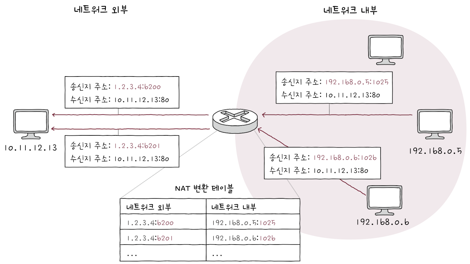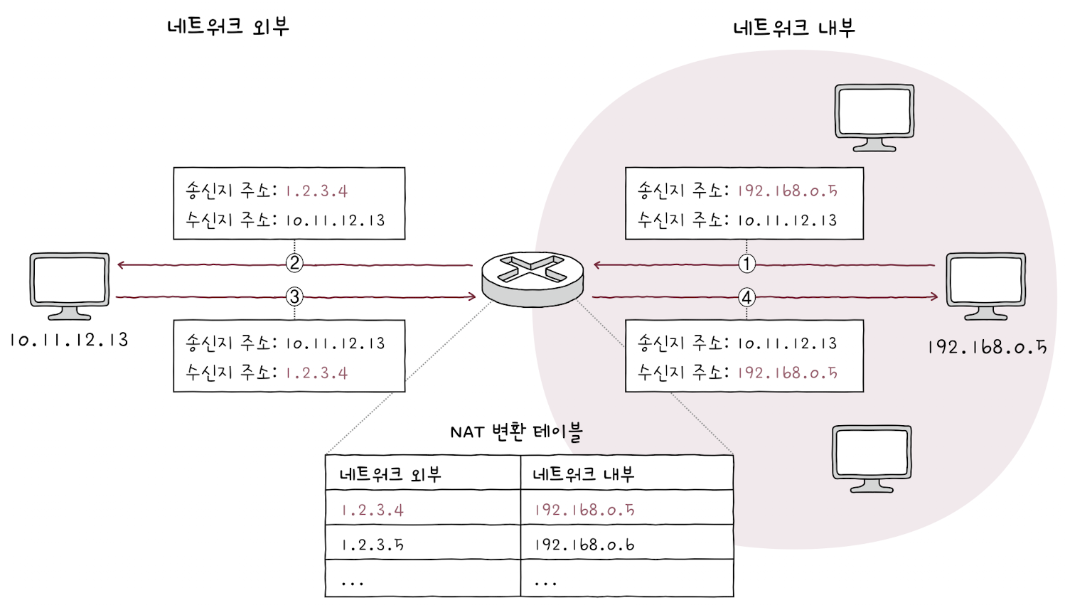 - ④ 이 패킷의 수신지 주소는 NAT 라우터를 거쳐 192.168.0.5가 된다.
