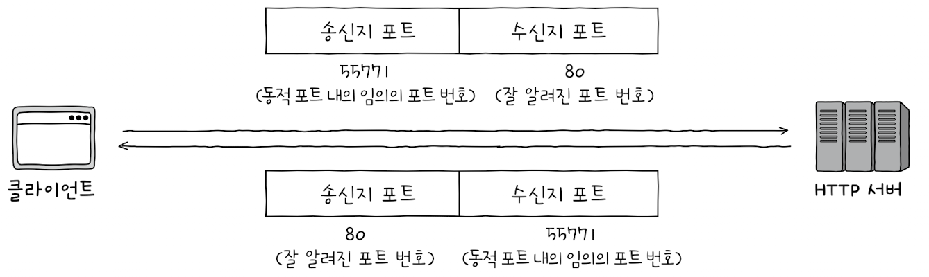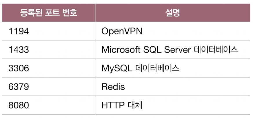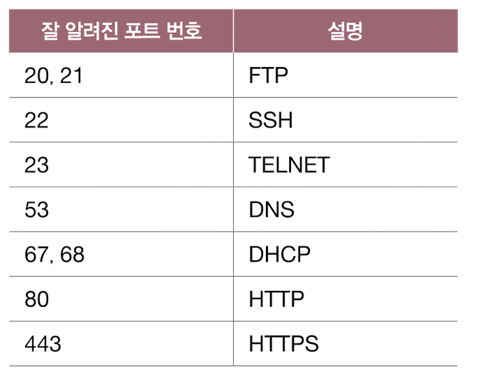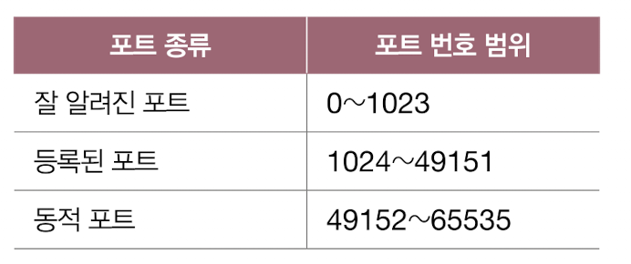 - 포트 번호 49152번부터 65535번까지는 동적 포트(dynamic port), 사설 포트(private port), 임시 포트(ephemeral port)라고 부른다.