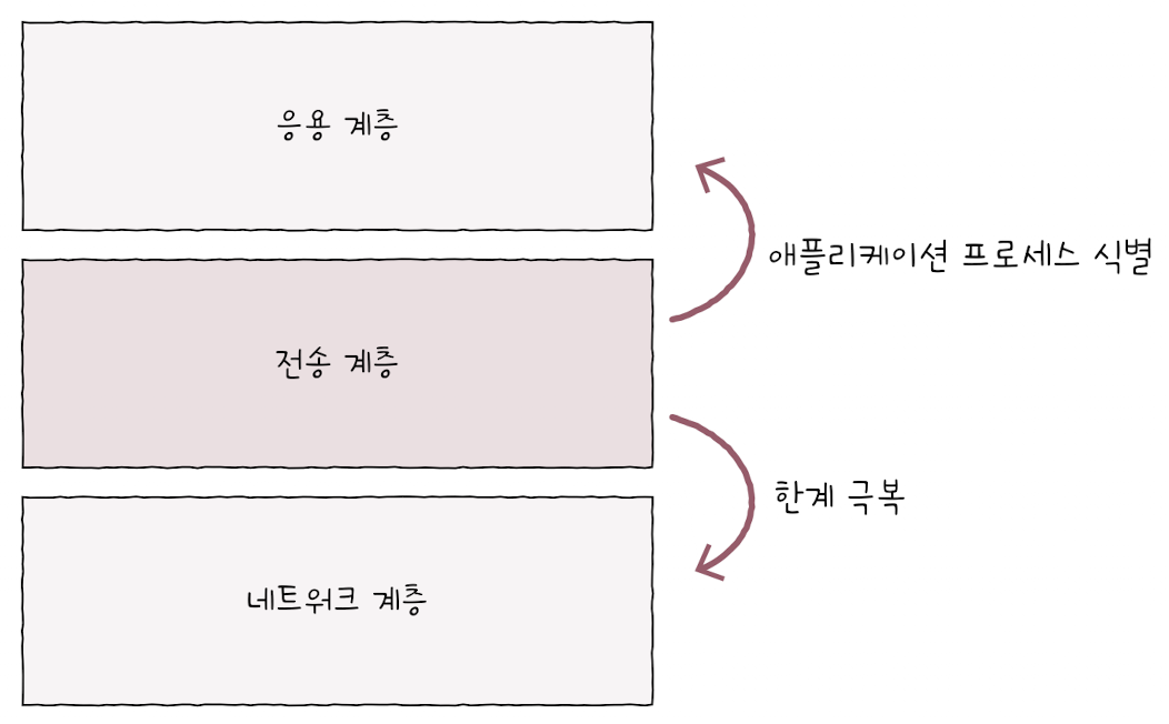 네트워크 계층과 응용 계층 사이에 위치한 전송 계층은 신뢰할 수 있는 통신과 연결형 통신을 가능하게 하여 이러한 IP의 한계를 극복하고, 포트 번호를 통해 응용 계층의 애플리케이션 프로세스들을 식별하는 역할을 수행한다.