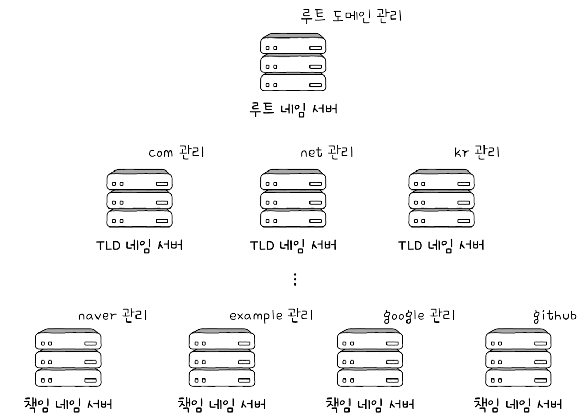 계층적인 도메인 네임을 효율적으로 관리하기 위해 네임 서버 또한 계층적인 형태를 이룬다. 또 네임 서버는 여러 개 존재하며 전 세계 여러 군데에 위치해 있다.