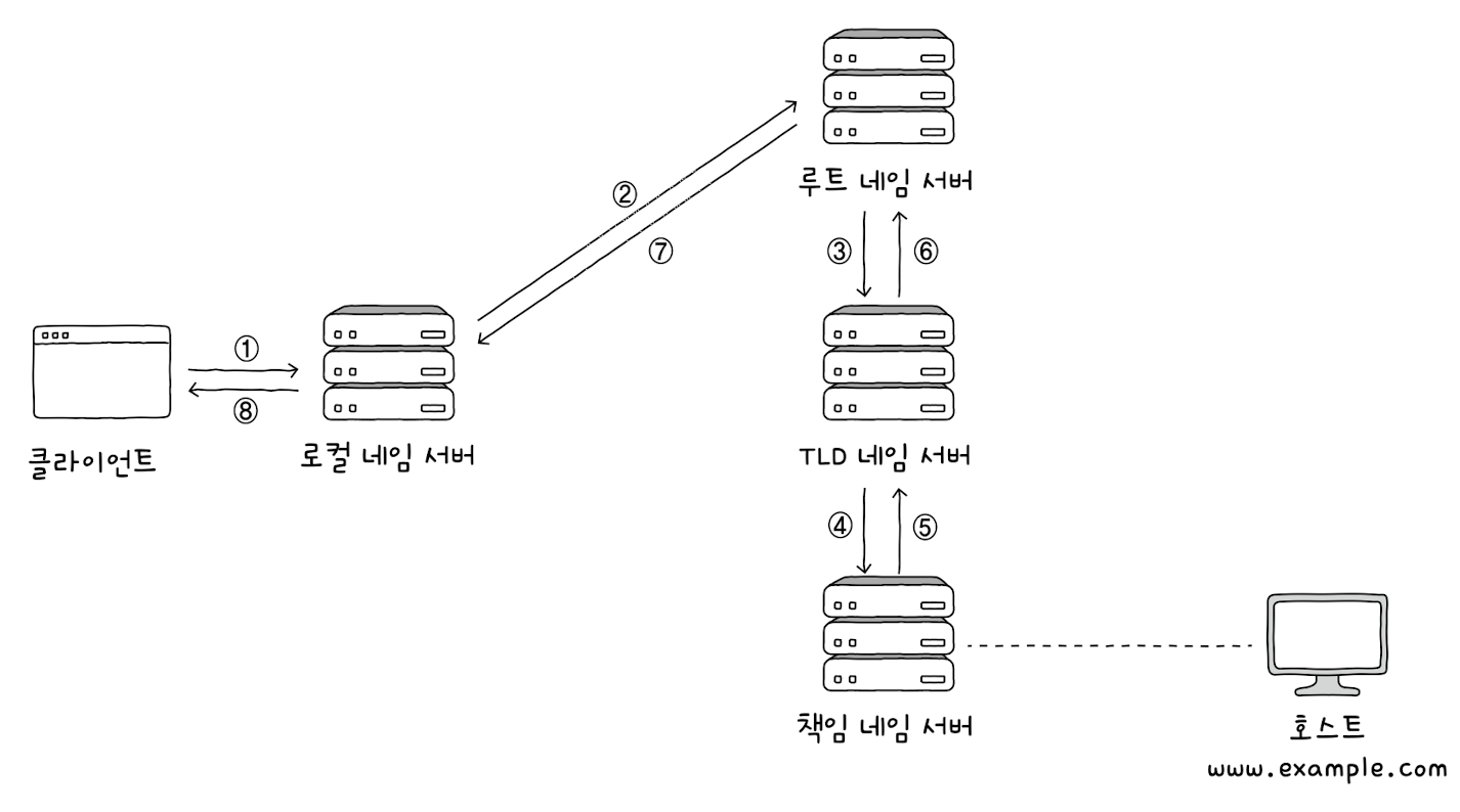이 과정에서 다양한 네임 서버들이 사용되는데, 중요한 역할을 담당하는 네임 서버의 유형은 크게 네 가지가 있다. 각각 ‘로컬 네임 서버’, ‘루트 네임 서버’, ‘TLD(최상위 도메인) 네임 서버’, ‘책임 네임 서버’이다.