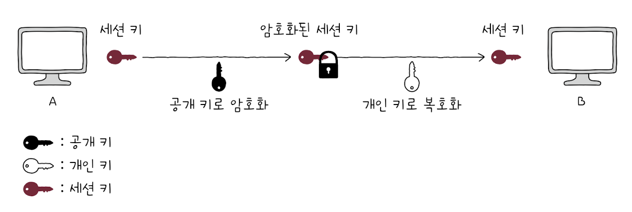 이렇게 하면 대칭 키를 안전하게 공유함과 동시에 공유된 대칭 키를 이용해 빠르게 암호화와 복호화를 수행할 수 있다.