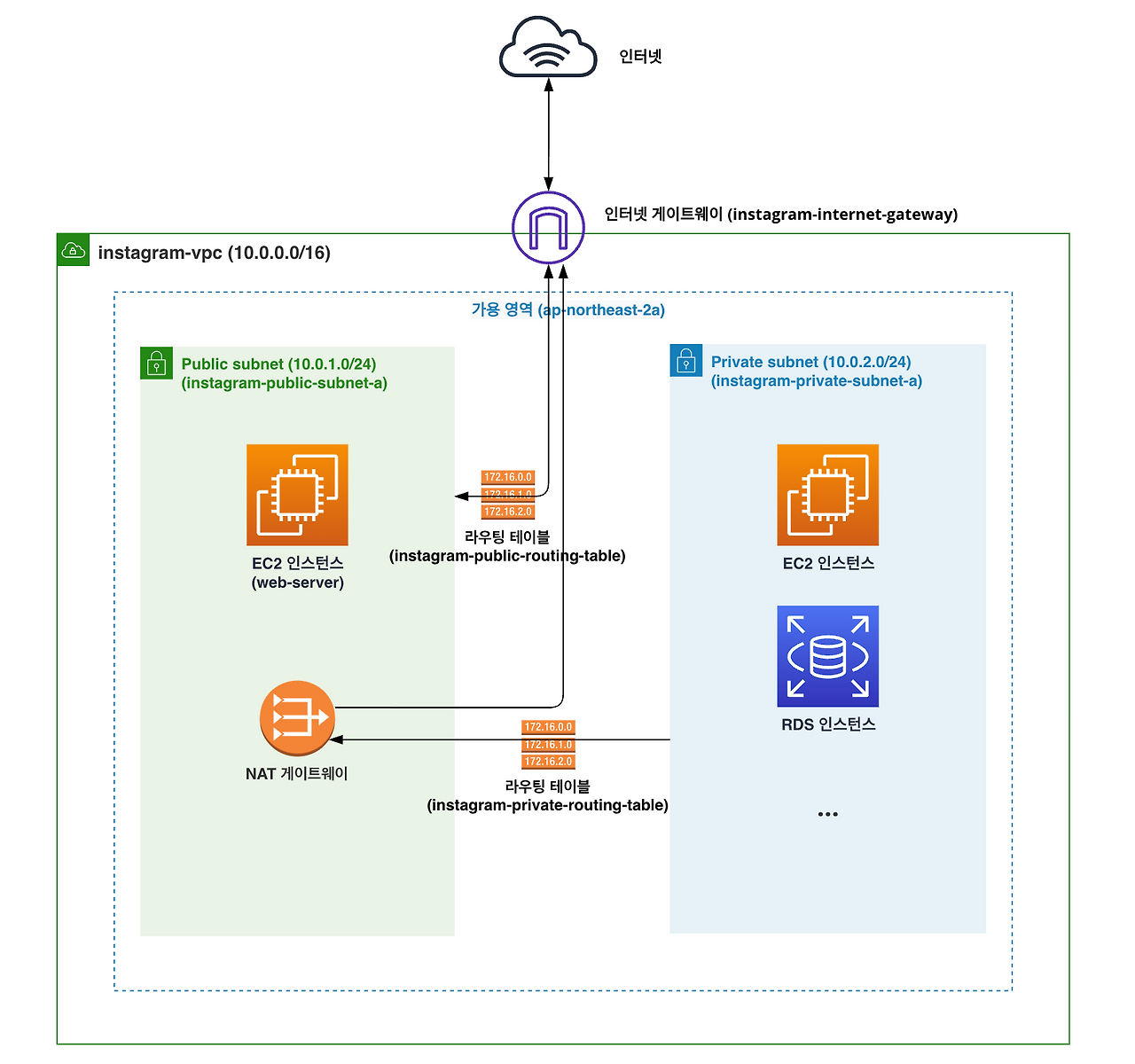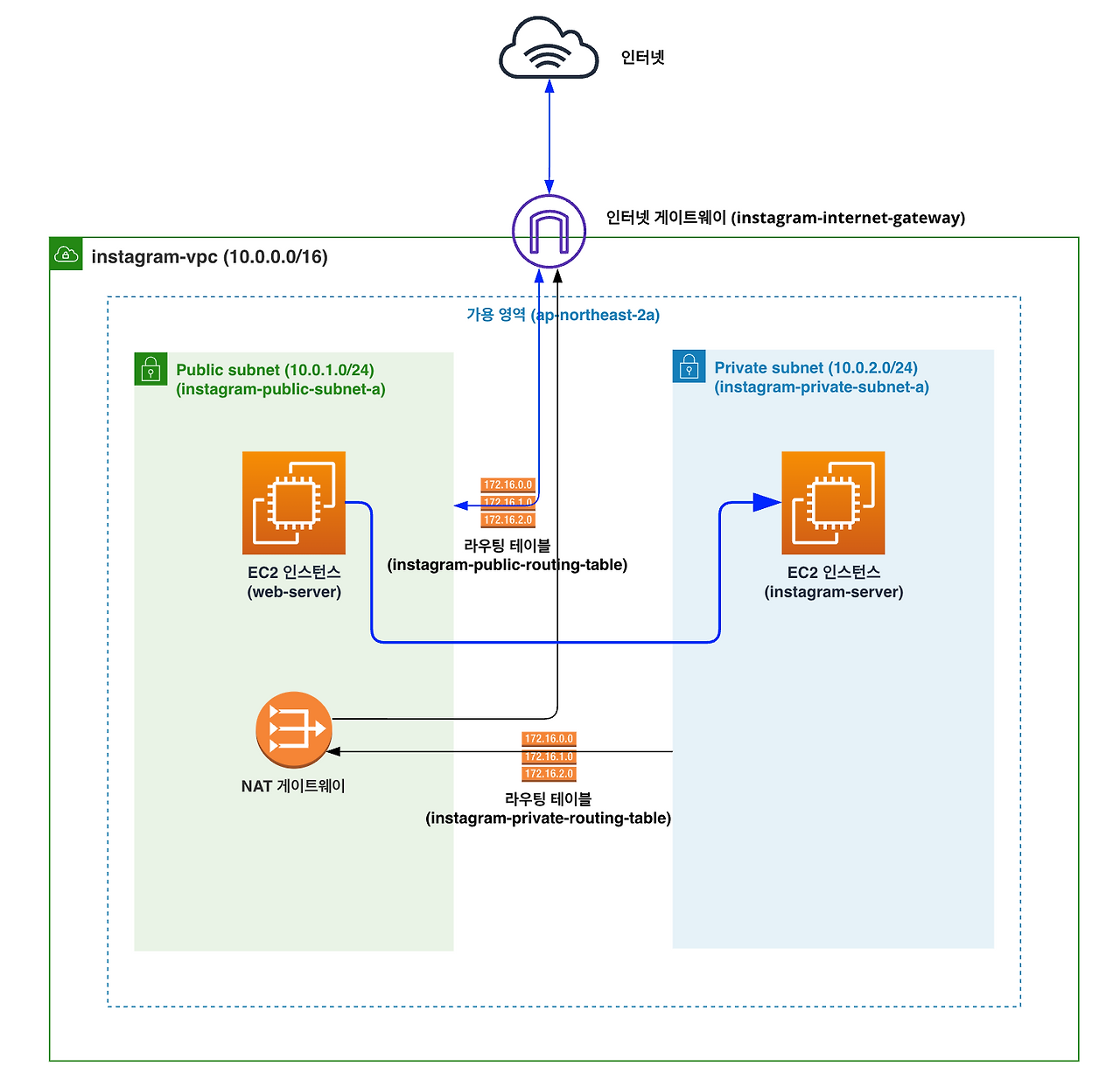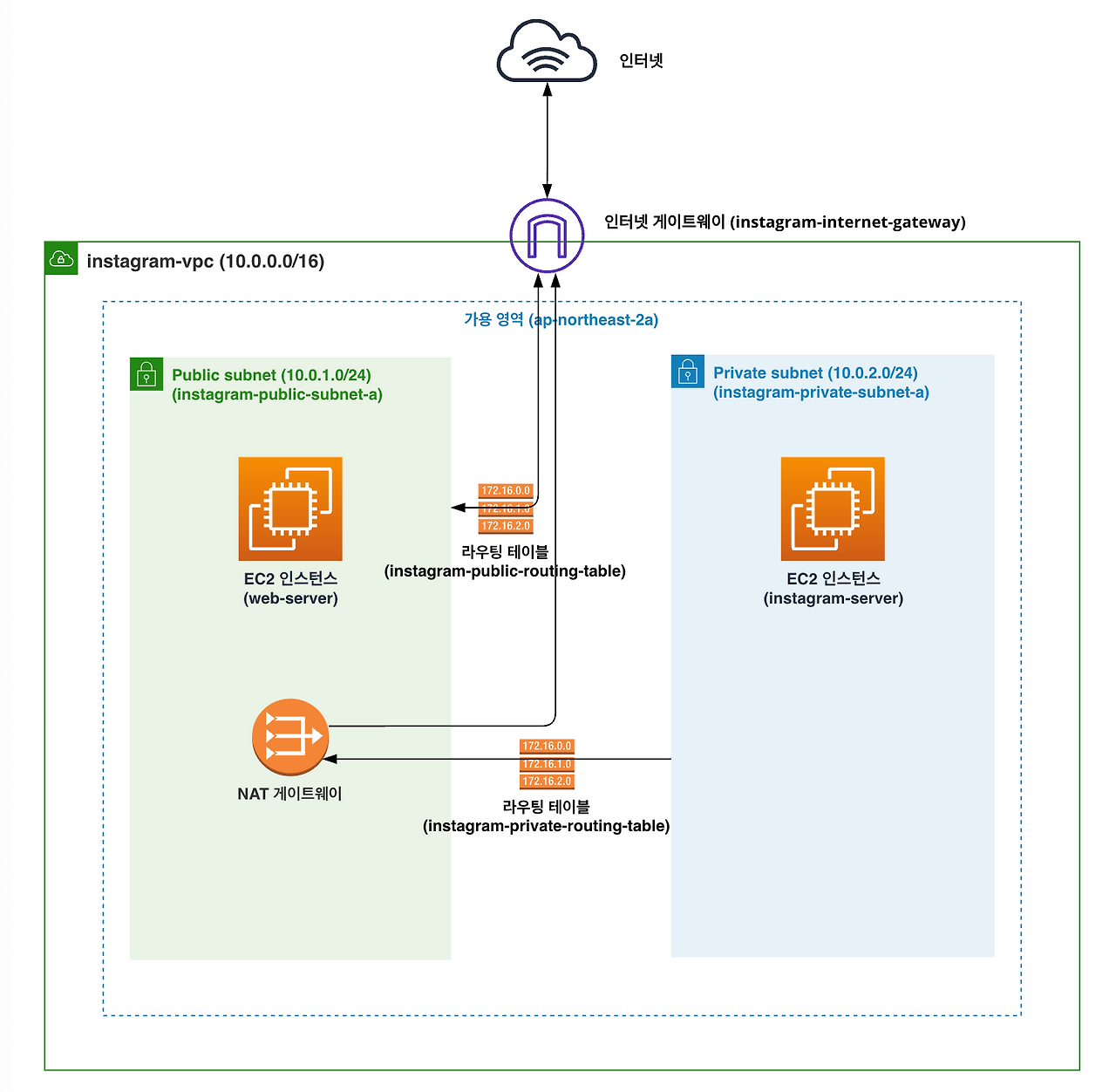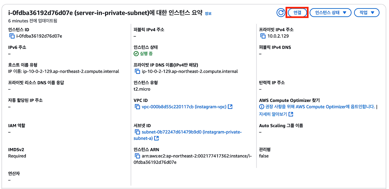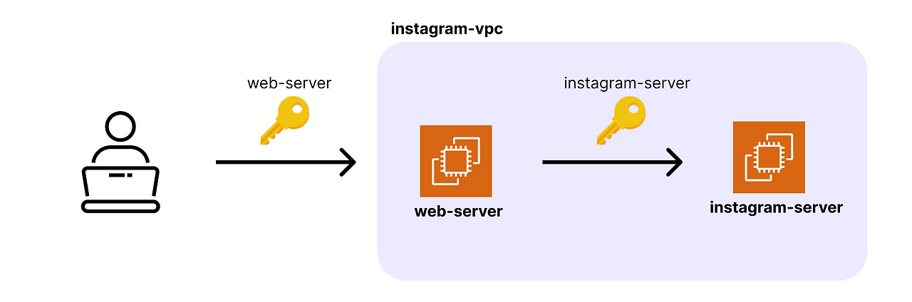 퍼블릭 서브넷에 위치한 EC2 인스턴스(web-server)에서 프라이빗 서브넷에 위치한 EC2 인스턴스(instagram-server)로 접속할 것이다. web-server 인스턴스에서 instagram-server 인스턴스로 접속하는 게 가능한 이유는 같은 VPC에 존재하기 때문이다.