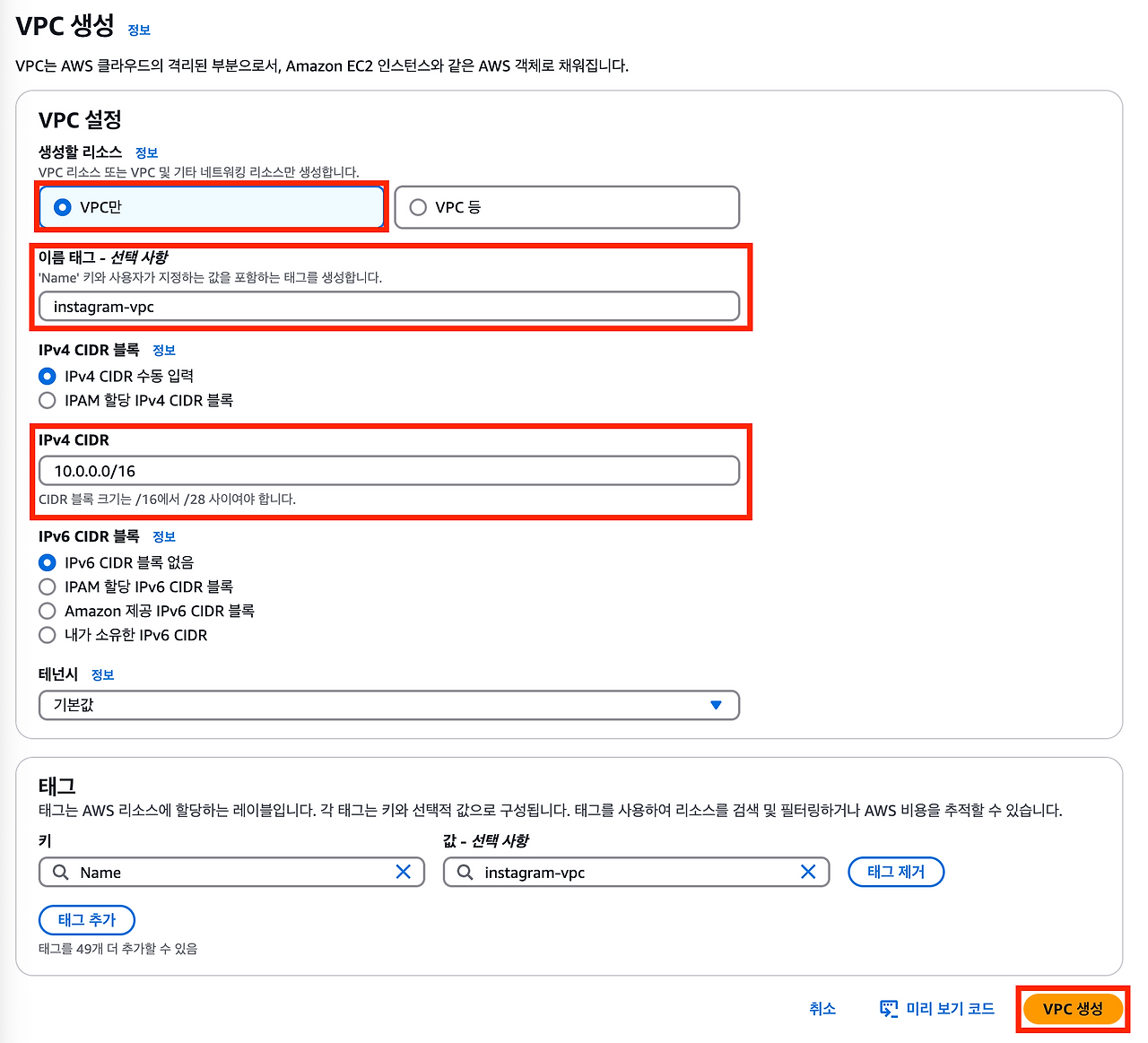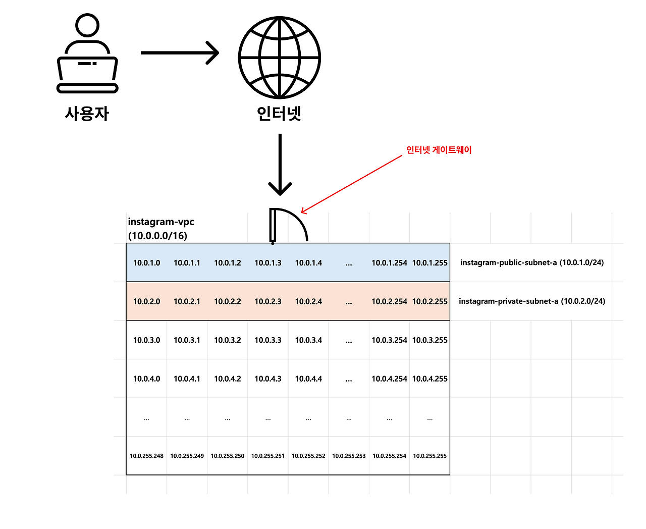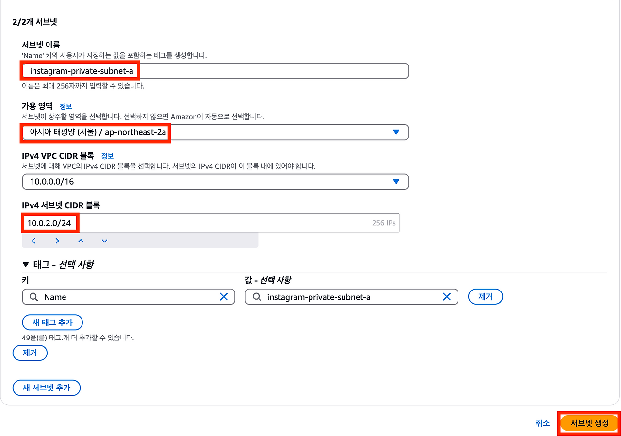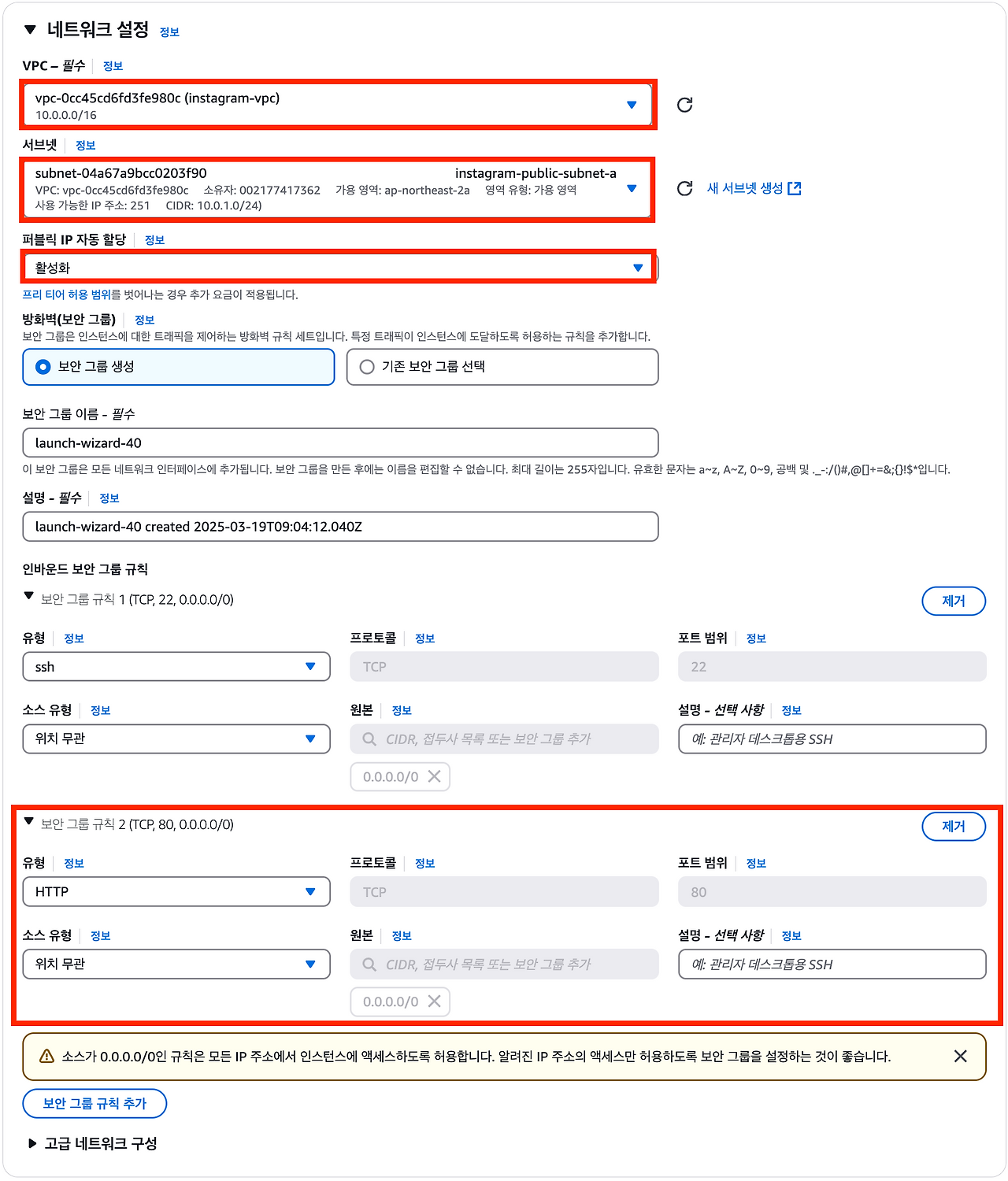 퍼블릭 서브넷에 위치한 EC2 인스턴스(web-server)에서 프라이빗 서브넷에 위치한 EC2 인스턴스(instagram-server)로 접속할 것이다. web-server 인스턴스에서 instagram-server 인스턴스로 접속하는 게 가능한 이유는 같은 VPC에 존재하기 때문이다.