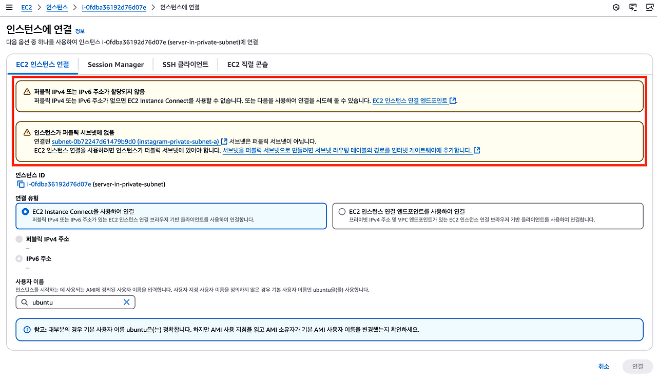 위 캡쳐 화면에서 퍼블릭 IPv4가 할당되지 않았고, 인스턴스가 퍼블릭 서브넷에 없어서 접속이 안 된다고 경고한다.