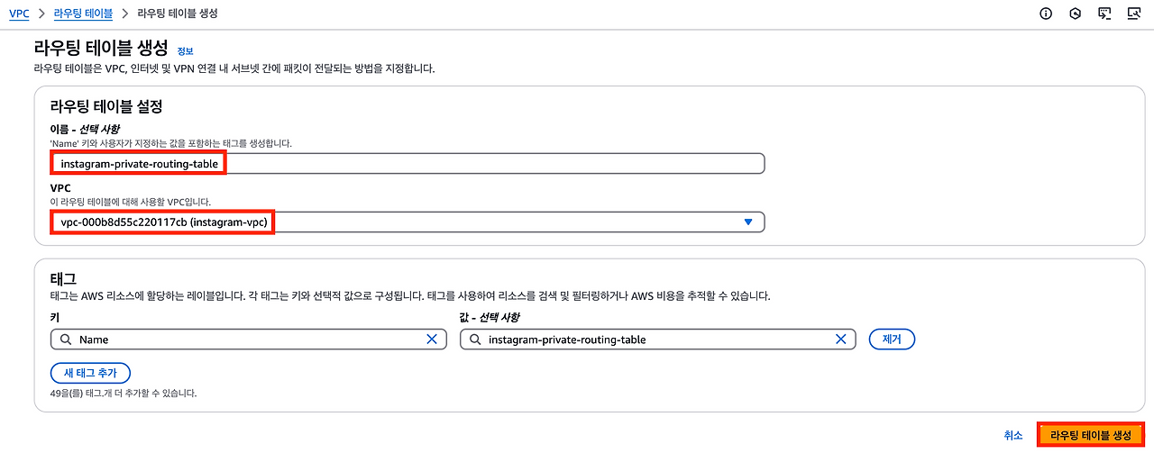 프라이빗 서브넷에서는 퍼블릭 서브넷과 달리 인터넷 게이트웨이를 셋팅하면 안 된다.