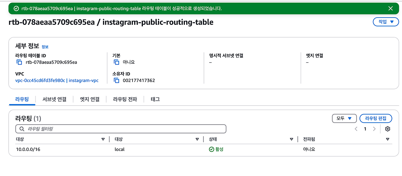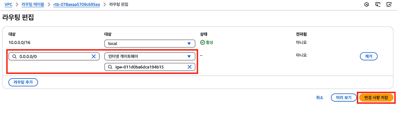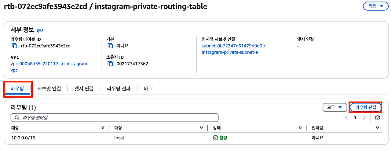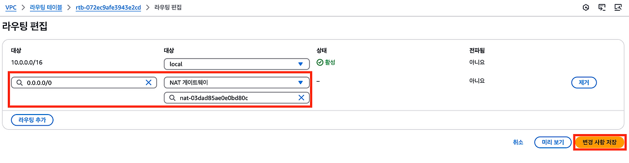 또한 10.0.0.0/16에 해당하지 않는 IP 주소로 요청을 보내면 NAT 게이트웨이로 트래픽을 보낸다.