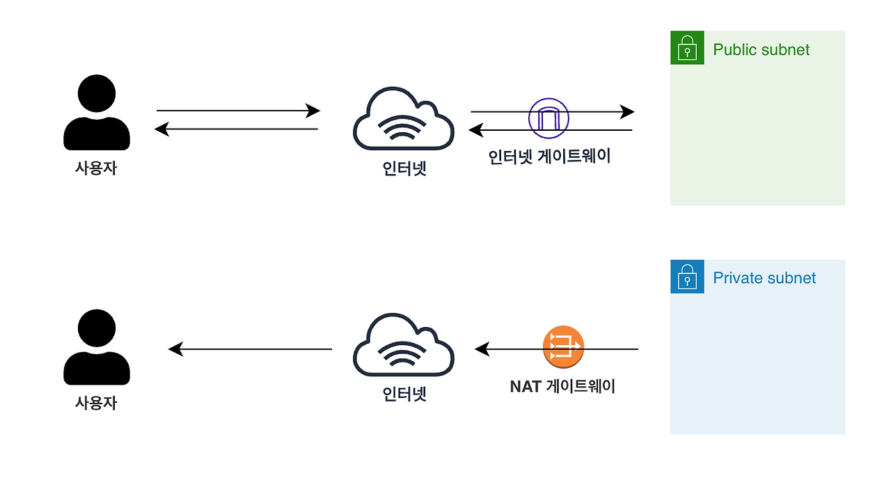 반면NAT 게이트웨이는 서브넷 → 외부 인터넷의 방향으로만 통신이 가능하다는 뜻이다.