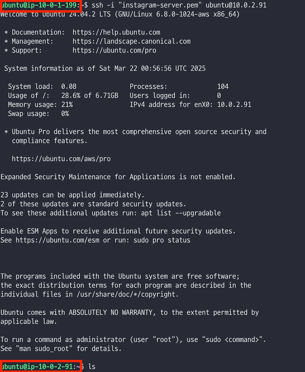 이걸 보고 리눅스에서는 hostname이라고 부른다. instagram-server에 접속하기 전후의 hostname을 비교해보니 잘 접속이 됐다는 걸 확실하게 확인할 수 있다.