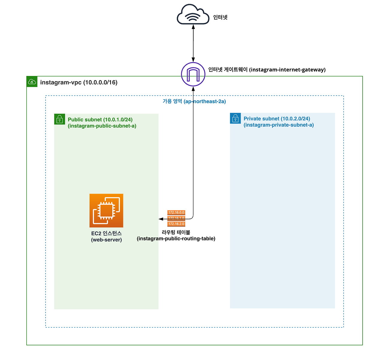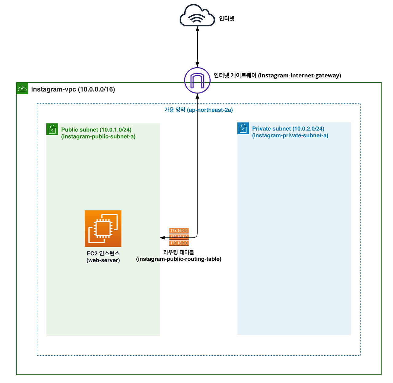 퍼블릭 서브넷에 위치한 EC2 인스턴스(web-server)에서 프라이빗 서브넷에 위치한 EC2 인스턴스(instagram-server)로 접속할 것이다. web-server 인스턴스에서 instagram-server 인스턴스로 접속하는 게 가능한 이유는 같은 VPC에 존재하기 때문이다.