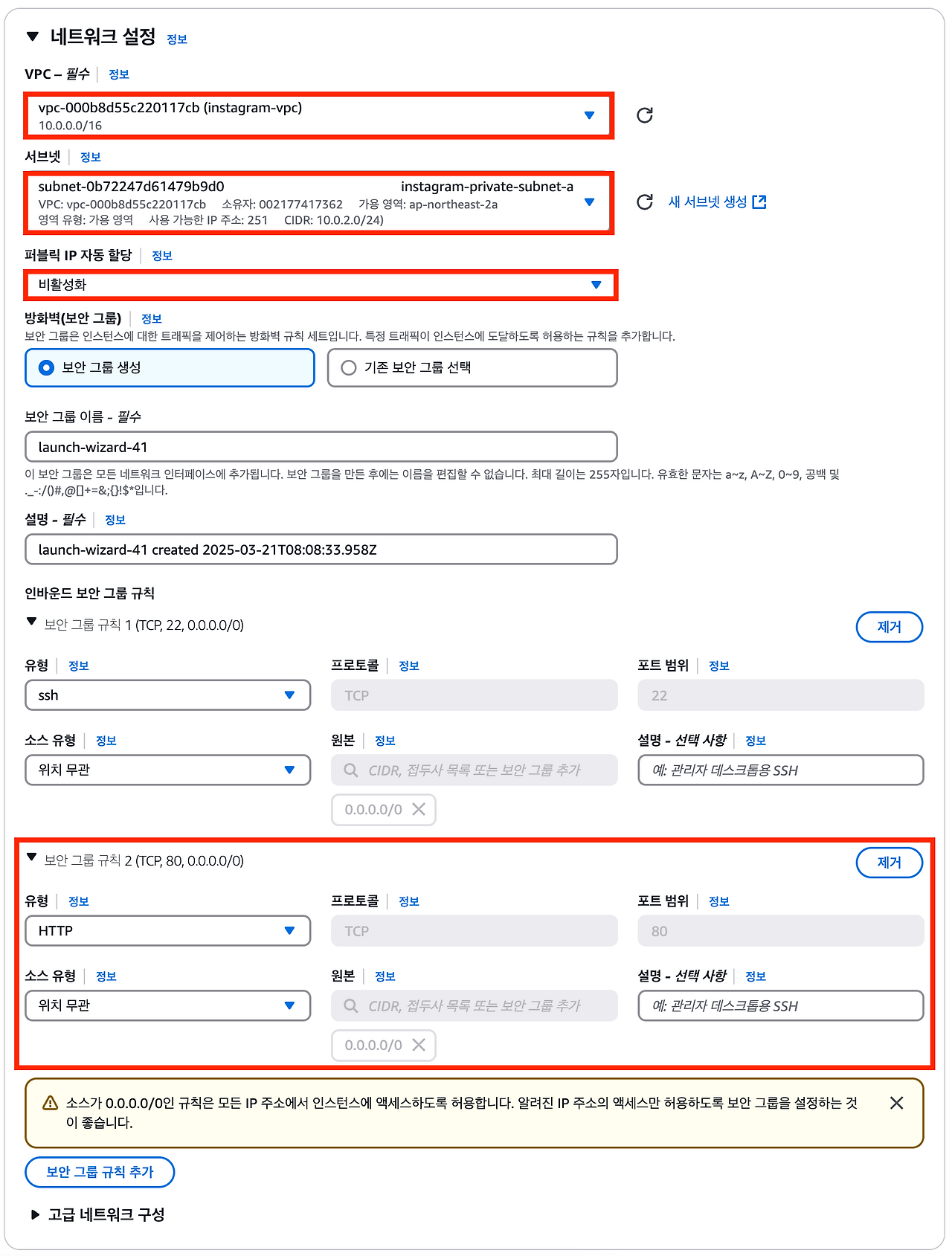 위 캡쳐 화면에서 퍼블릭 IPv4가 할당되지 않았고, 인스턴스가 퍼블릭 서브넷에 없어서 접속이 안 된다고 경고한다.