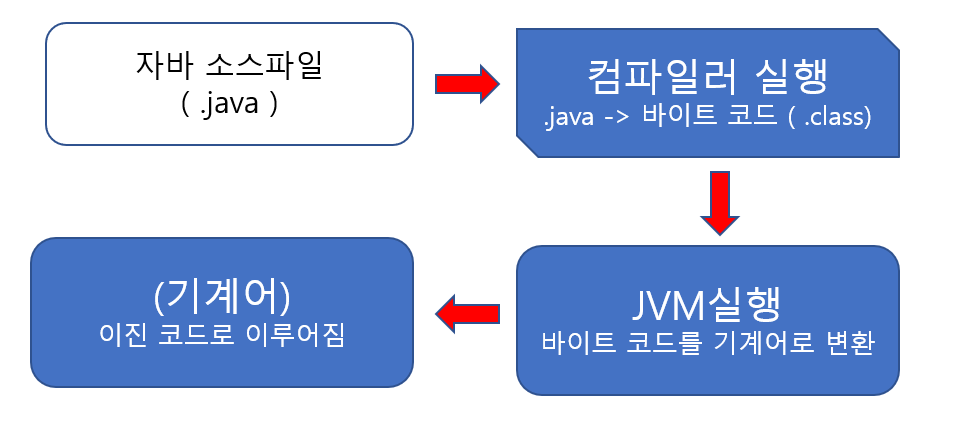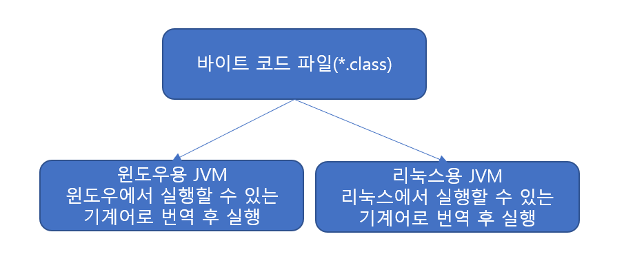 위의 그림에 나온 윈도우와 리눅스 외에 운영체제에서도 작동하게 해주는 JVM이 있으며, JVM은 각각의 운영체제에서 실행할 수 있는 기계어로 번역 후 실행한다.