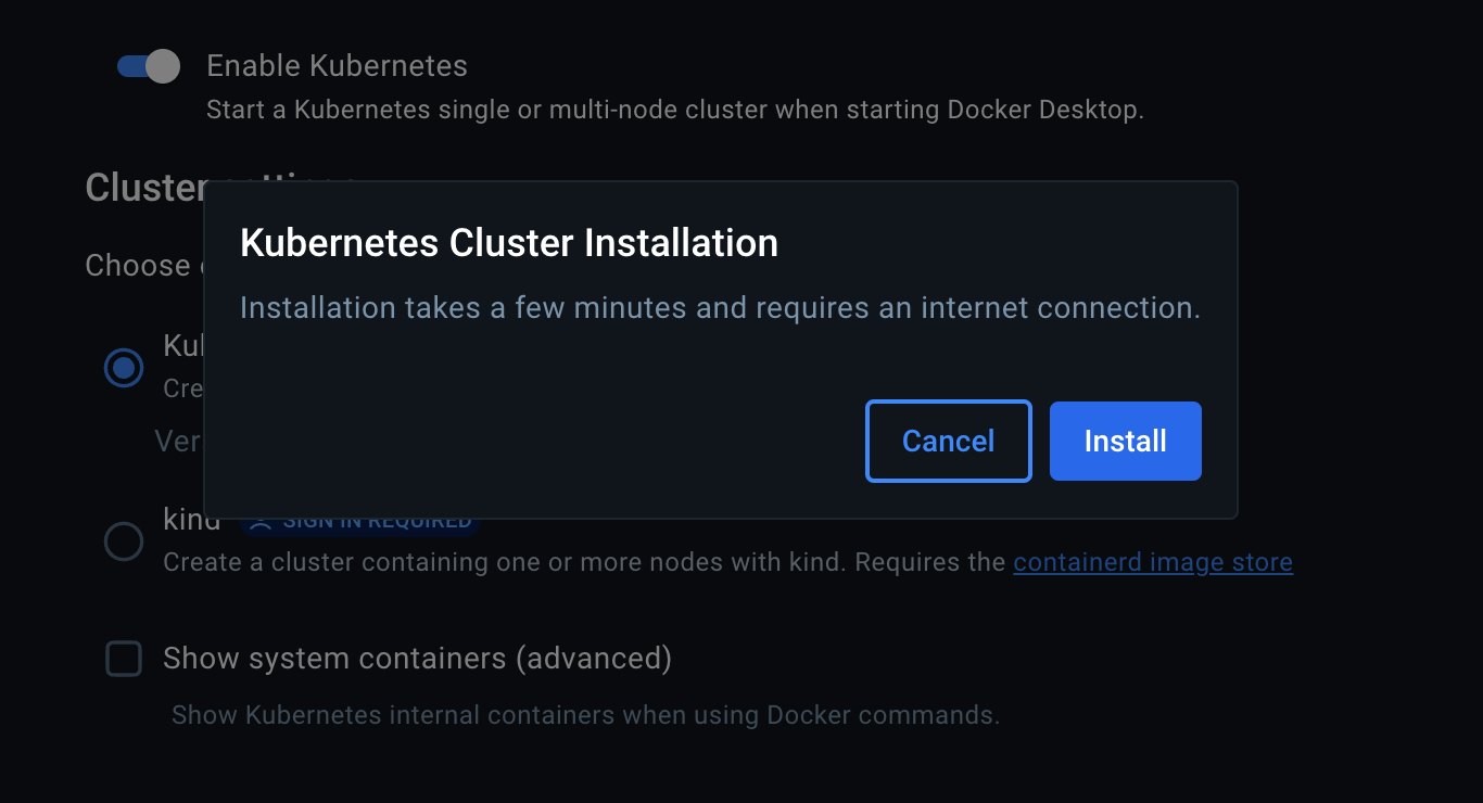 이후 아래 화면에서 install 버튼을 눌러서 쿠버네티스 클러스터를 설치한다.
