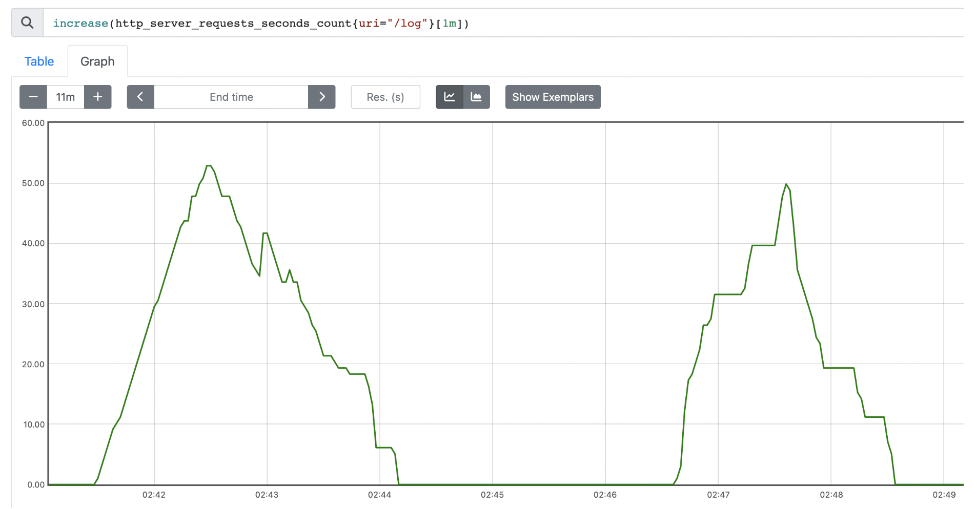 increase() 지정한 시간 단위별로 증가를 확인할 수 있다. 마지막에 [시간] 을 사용해서 범위 벡터를 선택해야 한다. 예) increase(http_server_requests_seconds_count{uri="/log"}[1m])