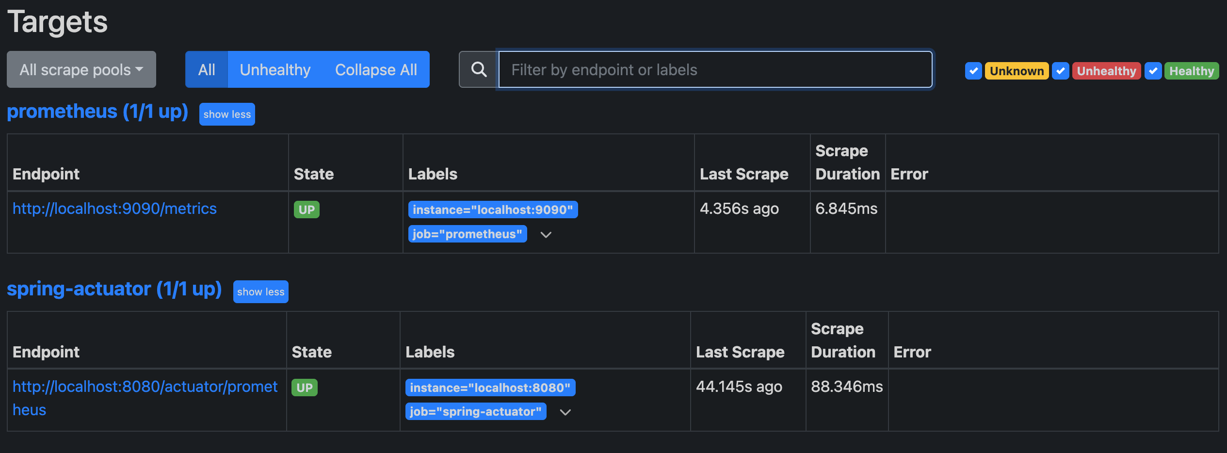 프로메테우스 메뉴 -> Status -> Targets 에 들어가서 연동이 잘 되었는지 확인