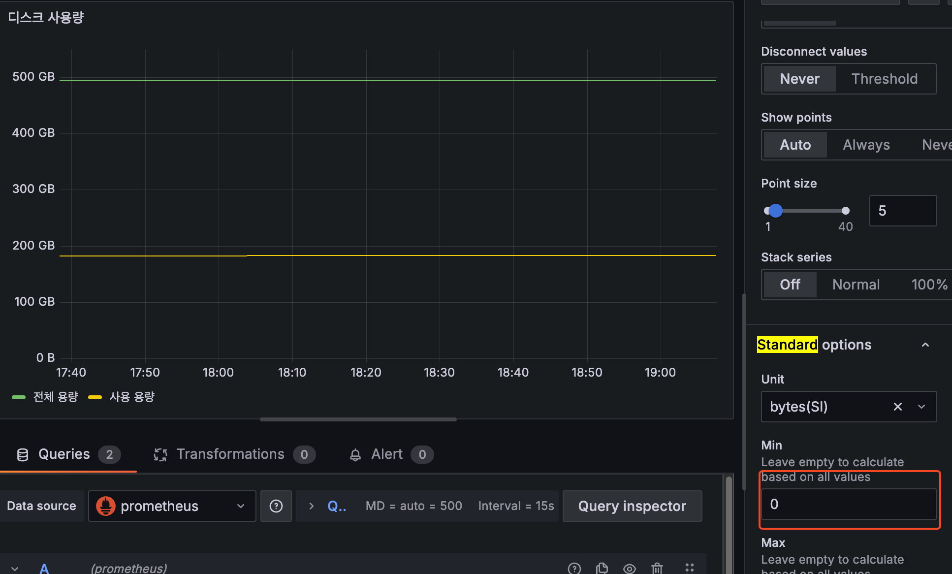 마지막에 [1m], [60s] 와 같이 표현한다. 지난 1분간의 모든 기록값을 선택한다.