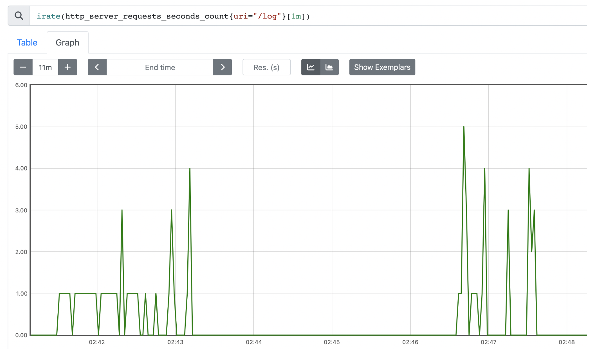 uri=/log , method=GET 조건으로 필터 : http_server_requests_seconds_count{uri="/log", method="GET"}